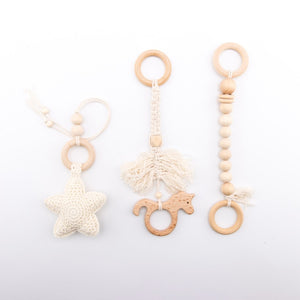 Les suspensions pour portique offre la possibilité à bébé qui ne sait pas encore s'asseoir de jouer, s'éveiller et se familiariser avec ses premières sensations de toucher mais aussi auditives, les figurines se choquent et s'entrechoquent et cela plait généralement beaucoup à bébé.