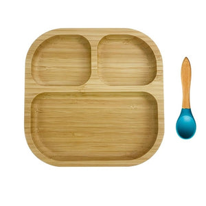 Lot assiette avec ventouse et cuillère en bambou - assiette carrée et cuillère bleue