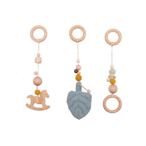 Les suspensions pour portique offre la possibilité à bébé qui ne sait pas encore s'asseoir de jouer, s'éveiller et se familiariser avec ses premières sensations de toucher mais aussi auditives, les figurines se choquent et s'entrechoquent et cela plait généralement beaucoup à bébé.